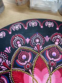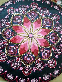 Splendido mandala realizzato interamente a mano su base circolare, caratterizzato da un intenso fondo nero che esalta le vibranti tonalità di rosa, fucsia e dettagli oro.
