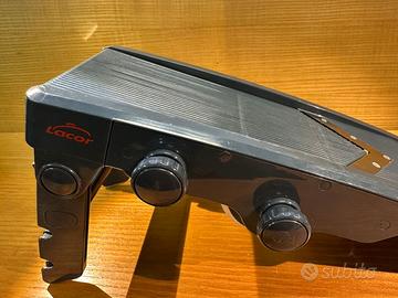 Mandolina marca Lacor in ottimo stato, alcune lame mai usate, altre pochissimo. L'articolo si compone di: base con appoggi estensibili e rullo lame planare a due profondità (6 e 9mm, con protezione), 5 tipi di lama, contenitore lame, impugnatura. Prezzo dell'oggetto nuovo €35. Alcune striature visibili sul piano di scorrimento sono dovute all'utilizzo dell'impugnatura, assolutamente consigliata in quanto le lame sono affilatissime.