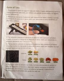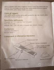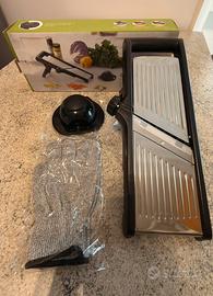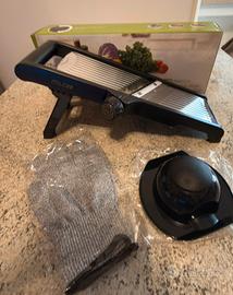 Mandolina per Verdure Professionale - Fetta da 1 a 9 mm di spessore. Due opzioni per le impostazioni julienne: 4,5 mm e 9 mm. Facile da usare - con una lama rotante regolabile incorporata, basta regolare la manopola per modificare le opzioni di taglio. Non è necessario toccare la lama. INCLUDE GUANTI RESISTENTI AL TAGLIO - ti offre la massima protezione durante il tempo in cucina. Design antiscivolo - nessuno scivolamento durante il taglio delle verdure. La maniglia di supporto è pieghevole e può essere ripiegata per riporla facilmente in un cassetto, oppure appendere al muro. Durevole e sicuro - realizzato in acciaio inossidabile di alta qualità, lama affilata e non facile da arrugginire. Completa di libretto istruzioni. NB: SPEDIZIONE SOLO CON INPOST O BARTOLINI - NO POSTE ITALIANE GRAZIE