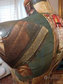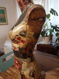 Manichino da donna decorato a mano, con tecnica decupage di vecchie riviste e giornali. Pezzo unico di artigianato vintage.