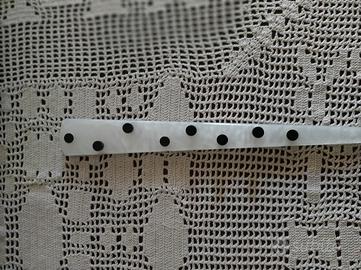 1 manico piatto triangolare oblungo in bachelite madreperlata con decorazione a tondi neri, davvero particolare.