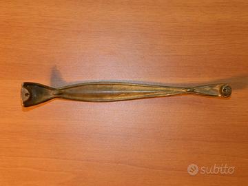 Maniglia per porte e cassetti di mobili d’epoca, in ottone lavorata a mano, con decori in rilievo, distanza foro-foro 157 mm, lunghezza 167 mm, larghezza 19 mm.