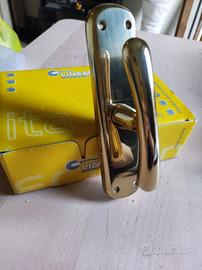 Maniglia cremonese per finestra con placca Garda Linea Calì nuova, mai utilizzata, in ottone lucido verniciato, completa di viterie e accessori per montaggio. Movimento martellina: Gratz con bussole. Riferimento: 671MP00000OL (vedi scatola) Scatola contenente 2 pezzi a Euro 10 caduno