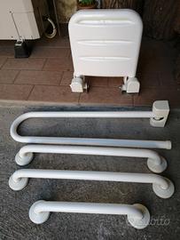 SET COMPLETO DI ACCESSORI BAGNO COME NUOVI. MATERIALE ITALIANO, DEL TUTTO RESISTENTE E AFFIDABILE. COMPOSTO DA UNA MANIGLIA cm 40 DUE MANIGLIE cm 60 UN MANIGLIONE RIBALTABILE cm 80 UN Seggiolino PER DOCCIA