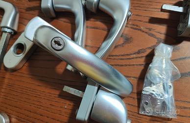 5 maniglie per finestra con serratura e chiave di bloccaggio, complete di chiavi e rosette di finitura.