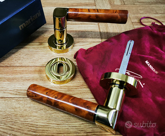 Coppia maniglie "MARIANI" in ottone lucido verniciato mod. Nika radica di noce con rosetta completa di accessori per il montaggio.