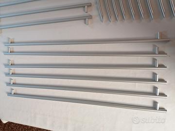 6 maniglie acciaio satinato cm. 70, 7 maniglie acciaio satinato cm. 50, 9 maniglie acciaio satinato ad unghia cm. 34, 11 maniglie acciaio satinato bronzo chiaro ad unghia cm. 34. Marca Hafele.