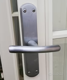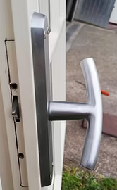 Vendo 8 maniglie in alluminio satinato per finestre in legno + 2 maniglie doppie per porta finestra con serrature