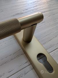 vendo 6 coppie di maniglie per porte interne. color oro satinato dal design moderno ed elegante. piacevoli al tatto con impugnatura satinata.