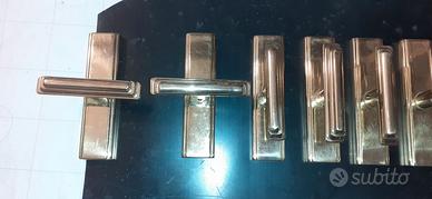 7 maniglie color oro per finestra di ottima marca italiana (ITALY BREV) e ottima fattura. Robuste, eleganti, massicce, in buonissime condizioni. Classico attacco su maschio quadrato (chiusura a vite a brugola). Misura piastra 15,00 cmx 3,8 cm.