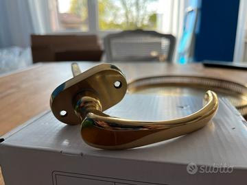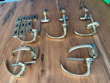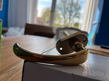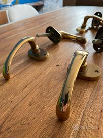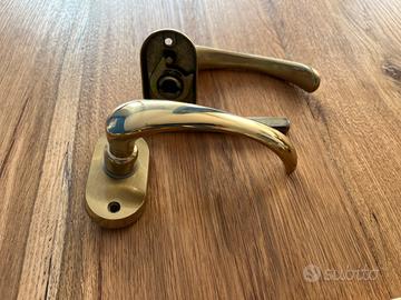Vendo in blocco 5 maniglie in ottone per porte interne, come da foto, in buone condizioni con leggeri graffi da usura. Se richiesto posso aggiungere nel prezzo tre serrature con chiave che erano abbinate alle maniglie in foto. In caso si volessero le serrature, é necessario cambiare la spedizione perché si supererebbero i 5 kg.