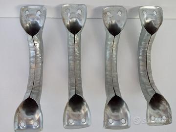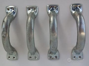 4 maniglie vecchie per porte di casa o mobili. Sono in lamierino di ferro, vuote all'interno, molto leggere ma comunque solide. Possono essere posizionate sia in orizzontale per cassetti o in verticale per porte.