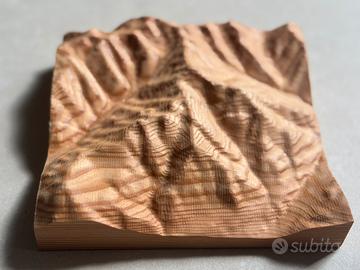 Mappa topografica 3D dei rilievi montuosi realizzata con cnc da un’unico blocco di legno.