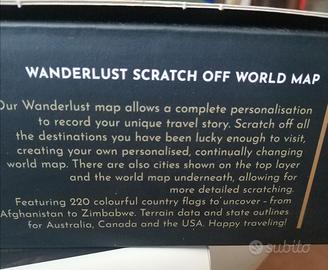 Mappa da grattare. Regalo ideale per viaggiatori. Si può grattare ogni paese visitato. Si compone di 2 mappe: mondo (61x43 cm) ed Europa (46x33). Articolo come nuovo, aperto ma mai utilizzato. All'interno della scatola si trovano anche un piccolo strumento per grattare e degli adesivi ancora imballati.