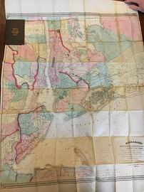 This is a visually striking and rare 1874 Matthew Drips and Asher and Adams map of the greater New York City area. Innovatively combining detailed land surveys with the work of the U.S. Coast Survey, the map depicts the New York City area from Sandy Hook and Monmouth County, north to include Staten Island, Newark, Manhattan and Yonkers. Coverage extends eastward into Long Island as far as Hicksville, Jericho and Freeport. All of Brooklyn, Jamaica Bay, and Queens are illustrated, along with parts of Westchester and much of northeastern New Jersey. The farmlands, islands, swamps, and parks of the region are also illustrated. The Croton Aqueduct appears as a thin black line in Westchester and the Bronx. Nautically, this map is heavily based upon the 1856 U.S. Coast survey of the same region compiled under the direction of A. D. Bache. It includes thousands of depth soundings and notes channels, buoys, and lighthouses where appropriate.