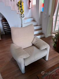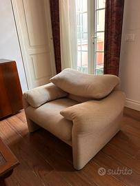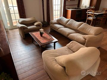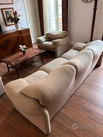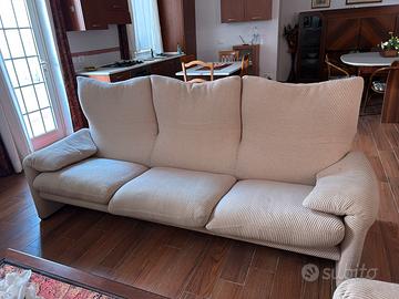 Divano 3 sedute 2 poltrone Vintage anni 80 La Maralunga, un'icona del design italiano, disegnata da Vico Magistretti per Cassina nel 1973, è uno dei pezzi più amati della storia dell'arredamento moderno. Le sue linee morbide e organiche e le sue proporzioni generose incarnano un grande comfort, ancor più perché ogni cuscino dello schienale può essere regolato in modo indipendente per creare uno schienale basso o alto. Un'idea rivoluzionaria degli anni '70 che ha permesso al Maralunga di ottenere il Compasso d'Oro. Questo particolare modello a 3 posti è rivestito con un tessuto a righe bicolore in beige chiaro e panna. Un sottile contrasto di tonalità che dona una splendida profondità, completando sia gli interni contemporanei che quelli classici. Questo divano in ottime condizioni necessita soltanto una pulizia profonda. Qualchebsegno di usura dovuto al tempo. Eventuale spediazione da concordare e a carico dell’acquirente.