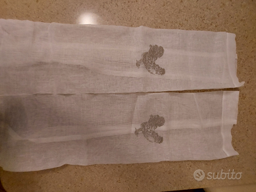 Marinette Saint Tropez coppia tendine in lino con ricamato un gallo larghezza cm 59 lunghezza fino alla punta cm 118, con il fiocco cm. 127
