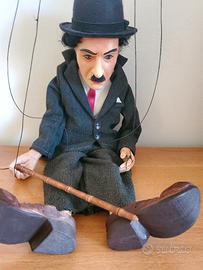 Il personaggio è curato nei dettagli: bombetta nera, baffetti iconici, completo scuro con cravatta rossa, scarpe grandi in stile retrò e bastone in legno. I movimenti sono comandati tramite crociera superiore in legno con fili integri.