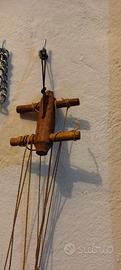 Materiale: legno intagliato e dipinto. Abiti tradizionali, paillettes e decorazioni varie. Argano in legno