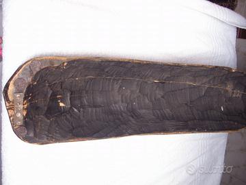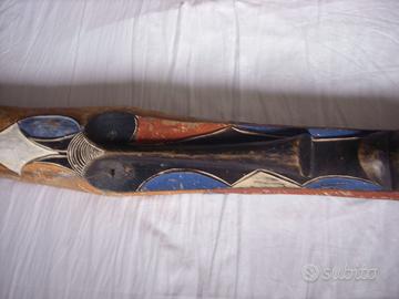 Vendo maschera africana dipinta, in legno scolpito e scavato a mano . Non è una maschera tribale "danzata" , ovvero utilizzata nei rituali e nelle gerarchie sociali, ma una bella maschera decorativa , di importanti dimensioni, con evidenti segni del tempo; sul retro presente riparazione che funge anche da attaccaglia .