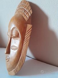 maschera africana in legno intagliato, un tipico esempio di arte tribale spesso utilizzata come elemento decorativo etnico. altezza 20cm Le caratteristiche principali di questo pezzo includono: Materiale: Legno massello, talvolta identificato come legno di iroko in varianti simili. Design: Presenta un volto allungato con occhi socchiusi, un naso sottile e labbra pronunciate. La parte superiore è decorata con un'acconciatura o un copricapo a griglia intagliata. Stile: È coerente con le maschere prodotte in diverse regioni dell'Africa occidentale (come la Costa d'Avorio) o centrale, spesso realizzate per il mercato dell'artigianato locale o come pezzi vintage.