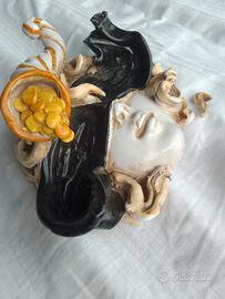 in argilla o non so che altro materiale possa essere. ottima manifattura, dipinta con colori che risaltano la bellezza della maschera. in cima vi è una cornucopia, si può appendere al muro o appoggiarla sul tavolino. vi è, da una parte, un piccolo pezzettino, di un ciuffo di capelli rotto che forse si potrebbe incollare. dall'altro lato ne manca un altro piccolo frammento che si è rotto e che io non trovo. mai esposta di ottima manifattura firmata all'interno