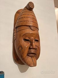 Vendo maschera etnica africana in legno iroko/teak massello, ereditata e conservata in eccellenti condizioni. Si tratta di un pezzo artigianale degli anni '70 proveniente dall’Africa Occidentale (probabile area Yoruba, Nigeria), scolpito interamente a mano e ricco di dettagli incisi.