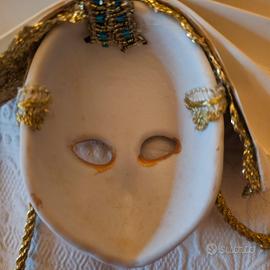 maschera in ceramica veneziana rappresenta Colombina dipinta a mano con applicazioni di tessuto sempre applicate a mano. ideale da appendere o da tenere in una teca. ritiro a mano a Milano o a domicilio Rozzano