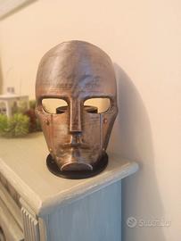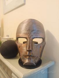 Magnifica riproduzione stampata in 3D della maschera di ferro e decorata a mano. L'oggetto presenta una finitura che riproduce fedelmente l'aspetto ferroso/metallico dell'armatura originale