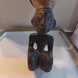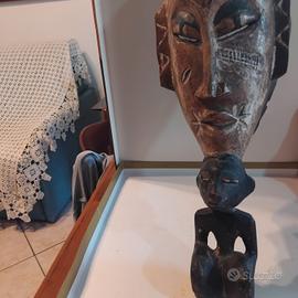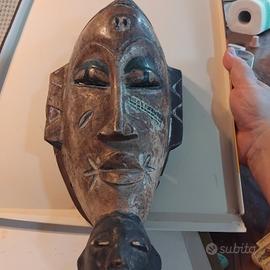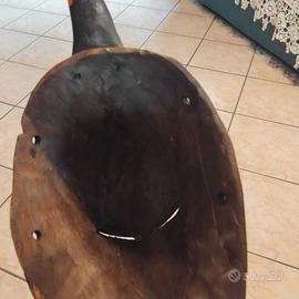 Grande maschera africana di cm 56 x 18 in legno. Acquistata in un mercatino vintage nei primi anni 2000. Oggetto molto affascinante e di sicuro impatto visivo. Nella parte superiore della maschera si nota la mancanza di un qualcosa ( evidenziato in foto) . Il venditore accennò vagamente a una sorta di cimiero probabilmente di piume di uccelli che sarebbe andato distrutto nel tempo, ma sinceramente non saprei dire.