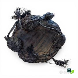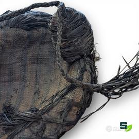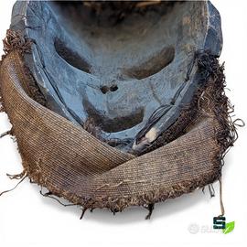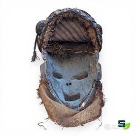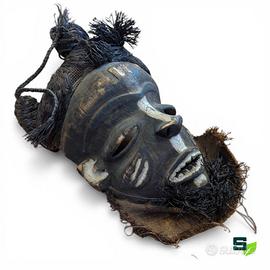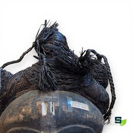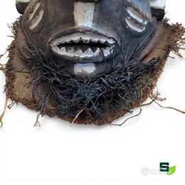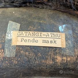 Maschera Pende Thangi autentica dei Bapende orientali (R.D. Congo), collocabile nella nel II quarto del XX secolo. Realizzata in legno leggero intagliato a mano, annerito da patina naturale d’uso rituale con pigmenti bianchi in forte contrasto. Occhi grandi, naso sottile, bocca con denti aguzzi. Cappuccio ricco in fibre di raffia nera intrecciata, con dettagli tessili usurati da performance cerimoniali legate a iniziazioni e riti sociali. Dimensioni 38x22x18 cm. Buone condizioni generali: lieve polvere superficiale rimovibile, minime abrasioni coerenti con eta', struttura solida senza danni gravi. Etichetta originale GATANGI-ATHU Pende mask conferma attribuzione catalogata. Pezzo da collezione etnografica di pregio estetico e culturale. Ideale per collezionisti di arte tribale africana.