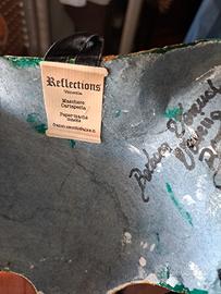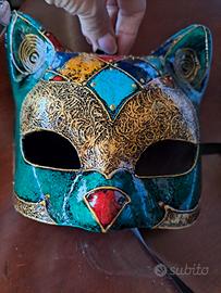 Maschera in cartapesta fatta a mano, decorata in stile arlecchino con finiture dorate. Modello "gatto", firmata dall’artigiano sul retro e con etichetta originale "Reflections Venezia". Pezzo autentico dell’artigianato veneziano, ideale per collezionisti o amanti del Carnevale di Venezia.