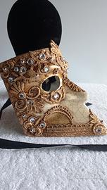 foglie d'oro, pietre Swarovski che fanno di questo pezzo un esemplare unico. Due lacci applicati alla sagoma per poterla indossare. Porta il logo all'interno della maschera.Mai usata,tenuta in ottimo stato.