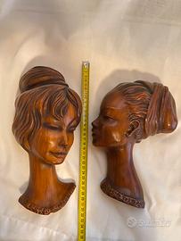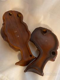 Coppia di maschera da parete, busti da muro vintage in ceramica smaltate nei toni dei marroni effetto legno tridimensionali raffiguranti due donne di profilo con capelli raccolti. Modelli 3723 e 3703, risalenti agli anni '50 e '60 Mid-century, realizzati nella Germania occidentale West Germany dal produttore Cortendorf Ceramics RS. Con il loro fascino vintage, emanano un'eleganza senza tempo di un'epoca passata. Un meraviglioso oggetto da collezione per gli amanti del retrò. In eccellenti condizioni praticamente perfette. Dietro fori per l'affissione alla parete, numeri di modello e timbri del produttore. Il prezzo è per 1 UNA maschera a vostra scelta.