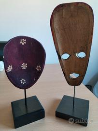 Vendo due maschere decorative etniche in legno con supporto da esposizione, ideali per arredamento moderno, etnico o collezione.
