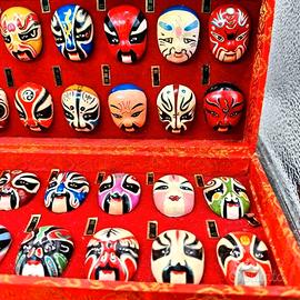 Maschere dell'Opera Cinese in miniatura 32 Maschere Lianpu (Maquillage Facciale) ovvero il trucco stilizzato utilizzato dagli attori dell'Opera di Pechino. Ogni colore e disegno rivela la personalità e il destino del personaggio: Rosso: Indica lealtà, coraggio e rettitudine (tipico di Guan Yu). Nero: Simboleggia un carattere fiero, onesto e imparziale. Bianco: Suggerisce astuzia, sospetto o malvagità. Giallo/Blu: Rappresentano spesso personaggi feroci, audaci o divinità. Oro/Argento: Riservati a dei, spiriti o figure immortali. Il Materiale: Argila dipinta a mano.