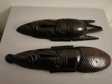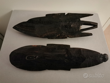 Vendo maschere etniche in legno come da foto. Provenienti dall'Africa. Lunghezza 23 cm circa, larghezza 7 cm circa. Solo consegna a mano a Roma. No spedizioni. No perditempo.