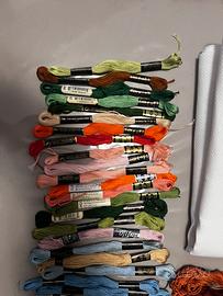 Matassine di vari colori e tela aida da 50 cm, le matassine sono di varie marche come potere vedere in foto, nuove mai usate….ancora- dmc- profilo, in totale sono 84 im vendita a euro 1 a matassina. In totale 84 trattabili