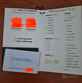 Tre materassi marca BoxMistral modello Variant, due singoli 85x180 cm e uno matrimoniale 170x180 cm, acquistati nell’estate 2023 e usati solo 1 mese in quanto si trovavano in una casa di vacanza. Le condizioni sono pari al nuovo. Si tratta di materassi di lusso prodotti in Italia e coperti da brevetto; sono ergonomici, indeformabili, freschi e asciutti, antiacaro/antimuffa. È possibile visionarli e ritirarli all’Isola del Giglio. Ci si può accordare per la spedizione con spese a carico dell’acquirente da quantificare.