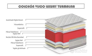 Usato 1 mese Troppo morbido x le mie ernie Qui la descrizione: Altezza totale del materasso +/- 25 cm. Imbottitura sul lato superiore con 4 cm di memory foam super soft di ultima generazione. Memory foam profilato poro per poro di ultima generazione che offre maggiore traspirabilità, elevata morbidezza e ripresa immediata. Nucleo ad alta densità in Ultracel HR, realizzato con componenti naturali. Sistema anatomica. Tessuto Tourmaline di alta qualità. Tourmaline è l'unico minerale in natura capace di generare elettricità permanentemente. Emittente naturale di ioni negativi con diversi benefici: Neutralizza i danni causati dagli ioni positivi. Aumenta la sensazione di benessere e migliora la qualità della vita. Migliora la funzione respiratoria. Migliora le condizioni psicologiche e fisiologiche. Aumenta il sistema immunitario. Stimola le cellule e i tessuti. Favorisce la circolazione sanguigna. Aumenta i livelli di ossigeno e stimola la vitalità cellulare. Stimola l'attività dei leucociti. Previeni lo stress ossidativo degli acidi grassi insaturi. Imbottitura superiore LUXURY TOURMALINE. Fascia con tessuto 3D multiporo altamente traspirante e assorbente. Chiuso con rifinitura liscia e resistente. 4 maniglie con rinforzo a farfalla per agevolare la movimentazione del materassso. Elevata durabilità. Certificato OEKO-TEX. Garantisce che i materiali di produzione non siano dannosi per la salute. Processo di produzione ecologico. Valido per letto articolato. Confezionato sottovuoto. CERTIFICATO DI AUTENTICITÀ TOURMALINE. Realizzato in Spagna.