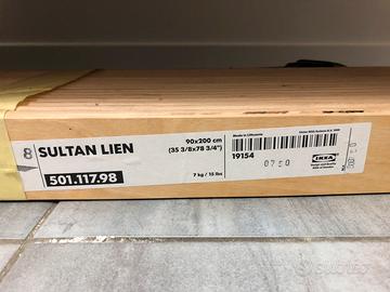 Materasso in memory foam e doghe in legno letto 90x200 linea Sultan Ikea. Materasso sfoderabile, fodera leggermente macchiata ma lavabile.