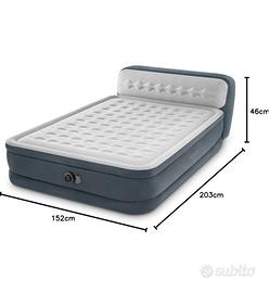 Vendo materasso gonfiabile matrimoniale di marca Intex, modello 64448ND. In perfette condizioni, nuovo mai aperto come si vede in foto. Misure: 152cm larghezza X 236cm Lunghezza X 46cm Altezza e 86cm Altezza dello schienale. Con Pompa elettrica integrata per gonfiare e sgonfiare in 5 minuti il materasso e materiali di alta qualità e resistenza con tecnologia Fiber-Tech. Vendo per inutilizzo a 80 euro. il prezzo può essere trattabile.