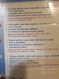 Materasso matrimoniale gonfiabile divisibile, eventualmente, in due singoli. Presenti anche due cuscini gonfiabili. Perfetto perchéprovato a gonfiarlo,mai usato. Misure standard.
