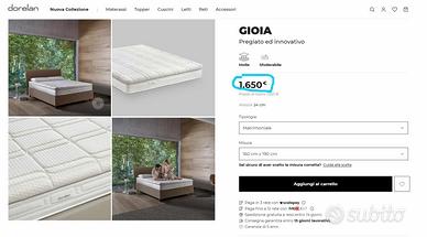 Materasso Matrimoniale Dorelan Gioia Pregiato ed Innovativo 160x190x24, imbottito in Memory + Molle indipendenti, acquistato ma INUTILIZZATO in attesa di ristrutturare l'abitazione di destinazione. Tenuto imballato. Si vende per cambio programmi. Acquistato 1.650 euro, si cede per fare spazio a meno della metà per evitare di perdere tempo, ovvero a soli 750 euro. Di seguito ulteriori informazioni sul materasso. La struttura di Gioia unisce l’elevata qualità di un pregiato sistema a molle indipendenti ad un doppio strato di confortevoli imbottiture sul lato invernale del materasso. Dotato dell’esclusivo e innovativo sistema Pillow Top, facilmente rimovibile e lavabile, viene imbottito in Myform Memory Clima che, oltre a rendere morbido e piacevole il contatto con il materasso, permette di controllare la temperatura di riposo con la massima precisione. Il sofisticato sistema a molle indipendenti Next, che rappresenta il cuore di Gioia, viene dotato di 7 zone di portanza differenziata ed è in grado di sostenere correttamente ogni zona del corpo, assicurando in questo modo il corretto posizionamento della colonna vertebrale e la massima elasticità. Materasso Anatomico a molle indipendenti con 7 zone di accoglimento differenziato che permettono una scelta anatomica mirata e personalizzata assicurando un sostegno ergonomico. Mantiene una postura corretta del corpo durante il riposo, prevenendo e alleviando dolori alla schiena, alla zona lombare, zona spalle e tratto cervicale.