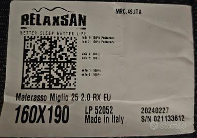 Materasso matrimoniale RELAXAN Miglio 25 (160x190x24) utilizzato 9 mesi. Confortevole grazie alla lastra in orthofirm e memory foam garanzia di supporto anatomico del corpo, imbottitura in fibra anallergica traspirante e rivestimento intessuto sfoderabilee lavabile con trattamento antibatterico.