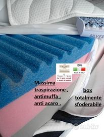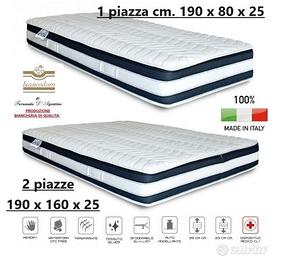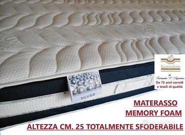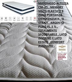La ditta biancodoro , propone materasso in memory foam visco elastico 3 strati , di eccellente qualità e manifattura . Traspirante , anti acaro , indeformabile , ergonomico , anti decubito , auto massaggiante , confortevole , riposante , anallergico . Un terzo della nostra vita lo passiamo riposando quindi dormire bene , vuol dire ( vivere meglio ) . Produciamo fuori misure , portanze personalizzate , guanciali , reti , copri materasso con pneumatico e topper . euro 379 è il prezzo di 1 materasso cm. 190 x 80 x 25 una piazza ( con guscio in argento come da inserzione) . Il materasso si adatta perfettamente alle naturali curve della colonna , è ipo allergenico , è esente da cariche elettrostatiche e la conformazione delle sue cellule assicura al corpo perfetta accoglienza e giusto sostegno . Per questo materasso pregiato bisogna usare esclusivamente reti a doghe in legno tassativamente della stessa misura . Non usare reti a doghe troppo larghe o a ripiano unico , perché questi supporti favoriscono il ristagno dell'umidità e, quindi , la formazione di muffe . La ditta biancodoro ove possibile porta i suoi prodotti direttamente dai clienti . Nelle foto abbiamo inserito le spiegazioni tecniche . Per ulteriori informazioni contattare la direzione . Ditta biancodoro , da 70 anni produzione , consulenza , vendita e assistenza diretta di : Corredi completi , biancherie e tessili per la casa . QUESTO MATERASSO E' IDEALE PER PERSONE CHE PESANO DA KG. 60 FINO A KG. 95 . N.B. QUESTO MATERASSO LO SPEDIAMO IN CONFEZIONE SOTTO VUOTO . N.B. SPEDIAMO MEDIAMENTE DOPO 7 GIORNI LAVORATIVI . N.B. PER FUORI MISURE O MATERASSI PERSONALIZZATE CI RISERVIAMO 10 GIORNI LAVORATIVI PER LA PRODUZIONE . PRODUCIAMO RETI ( ANCHE MOTORIZZATE ) GUANCIALI , TOPPER , BOX IN LINO , SETA E CARBONIO , SE DESIDERATE ACQUISTARE DIVERSI MATERASSI METTERSI IN CONTATTO CON LA DIREZIONE .