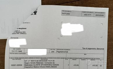 Vendo materasso Sogno Veneto Materassi, modello Aliante Sfoderabile 90 x 200, altezza 25cm. Materasso anatomico a molle e micromolle indipendenti e insacchettate, con piano in memory 3 cm. Il materasso è nuovo, con fattura di acquisto datata 28/03/2026.