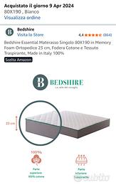 Materasso Bedshire Essential Singolo 80x190 cm in Memory Foam HD alto 23 cm quasi nuovo, in ottime condizioni, acquistato ad aprile 2024 (prezzo attuale 130 euro) e utilizzato saltuariamente come letto ospiti. Vendesi causa trasloco. No spedizioni, no perditempo.