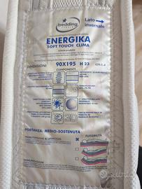 Vendo materasso singolo Bedding Italia – modello Energika Soft Touch Clima, dimensioni 90x195 cm, altezza 23 cm. - Struttura a molle insacchettate (234 molle) per un ottimo sostegno - Strato in memory foam (18 mm) lato invernale - Lato estivo traspirante con fibra e tessuto silver - Portanza medio-sostenuta, adatto a chi cerca comfort e supporto - Fascia laterale in tessuto 3D traspirante con maniglie - Prodotto Made in Italy Materasso comodo e di buona qualità, utilizzato ma ancora in buone condizioni.
