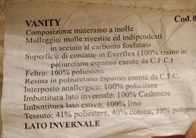 Vanity è un materasso matrimoniale quasi nuovo con struttura a molle indipendenti insacchettate singolarmente che permette di migliorare la circolazione sanguigna, di alleviare le infiammazioni cervicali e avere un riposo rigenerante.